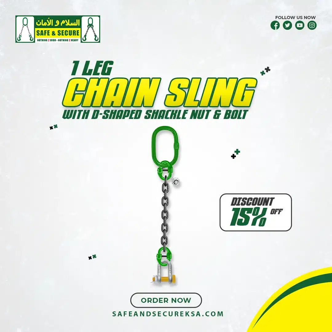 The “ONE LEG CHAIN SLING WITH D-SHAPED SHACKLE NUT & BOLT TYPE” is a robust lifting solution. Its durable construction ensures secure lifting, and the D-shaped shackle with nut and bolt adds versatility. This reliable sling demonstrates quality engineering for various industrial applications.
